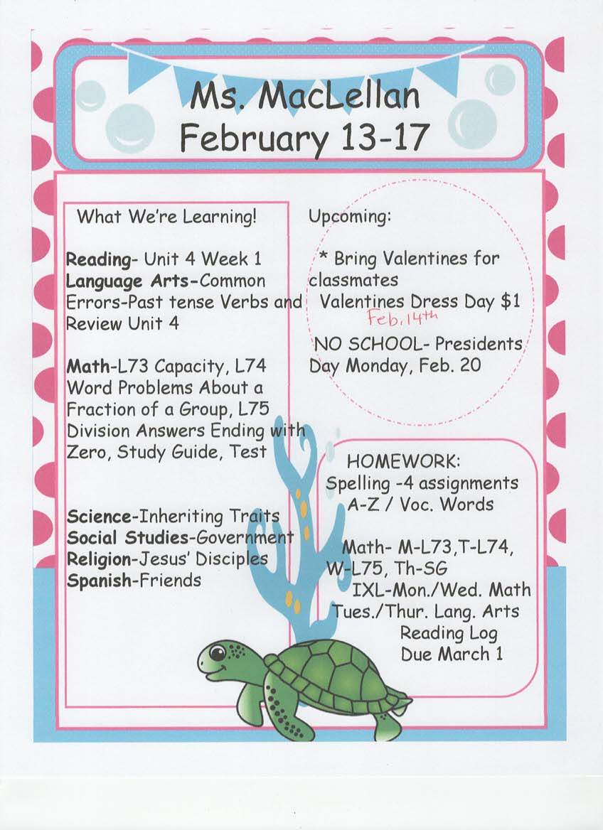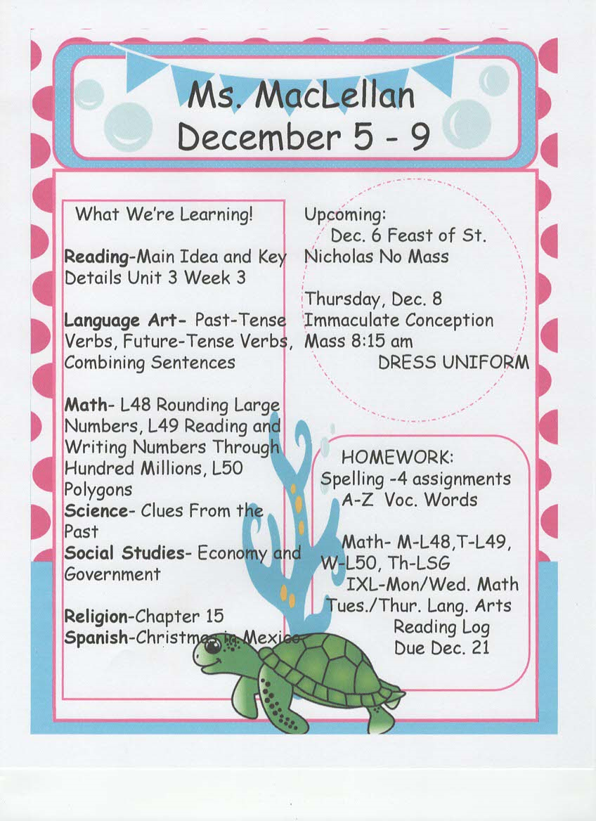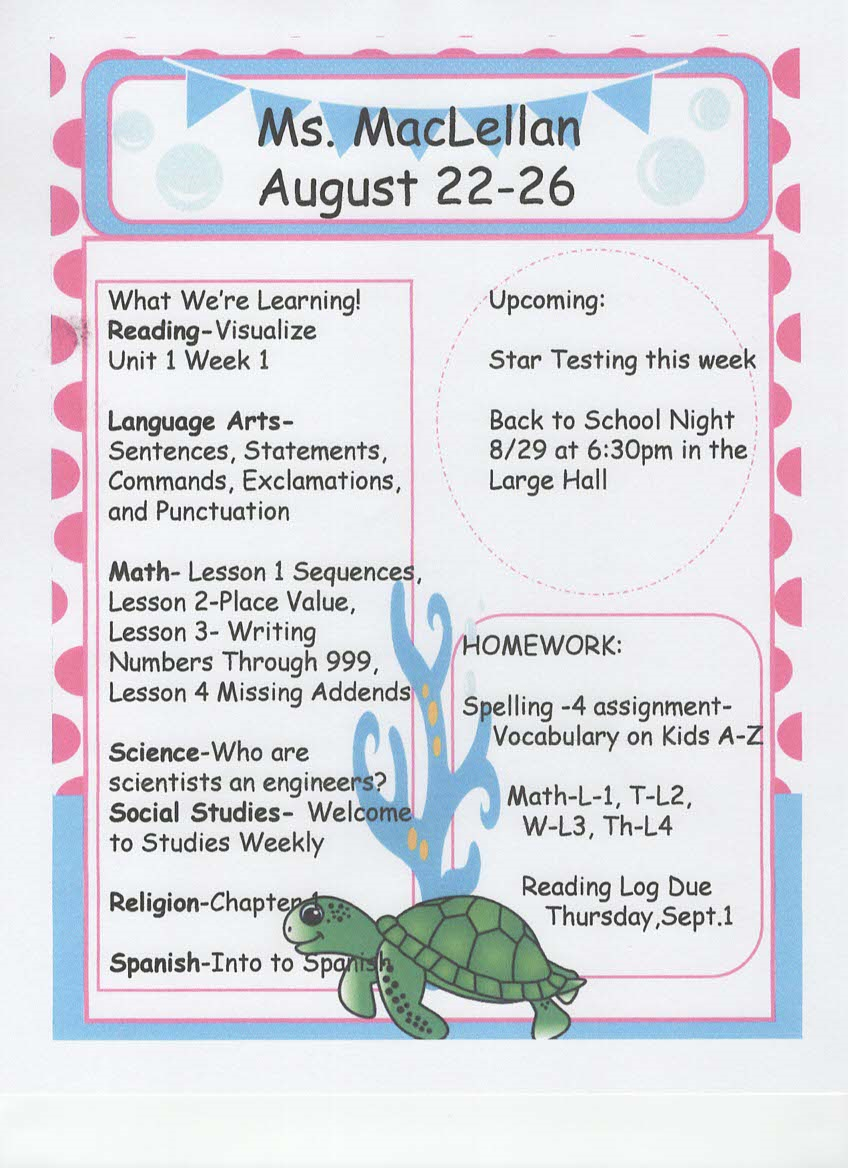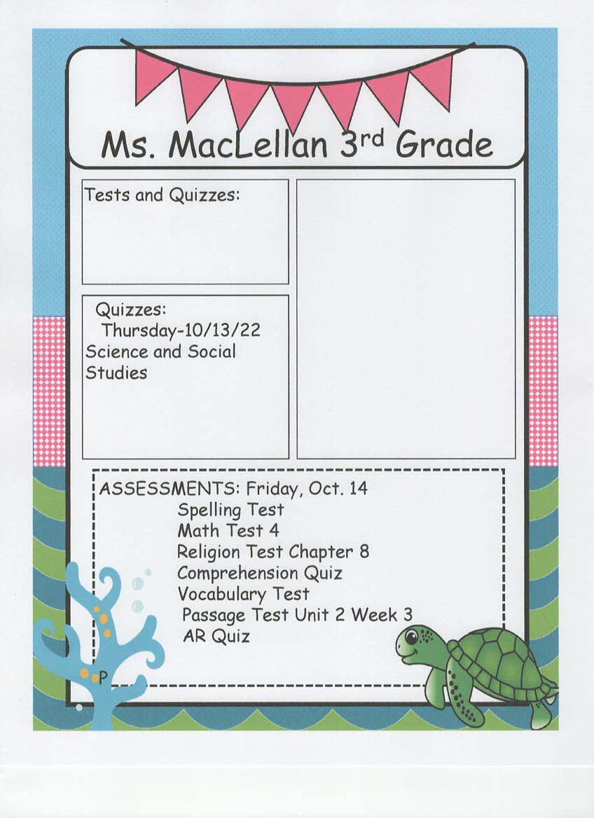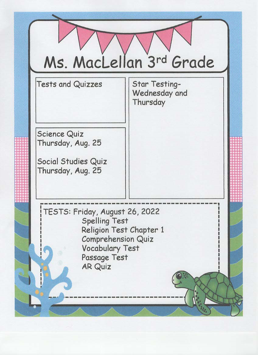 newsletter, tests, and spelling words