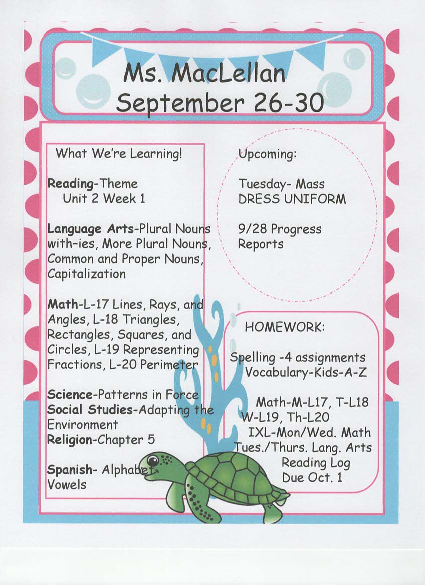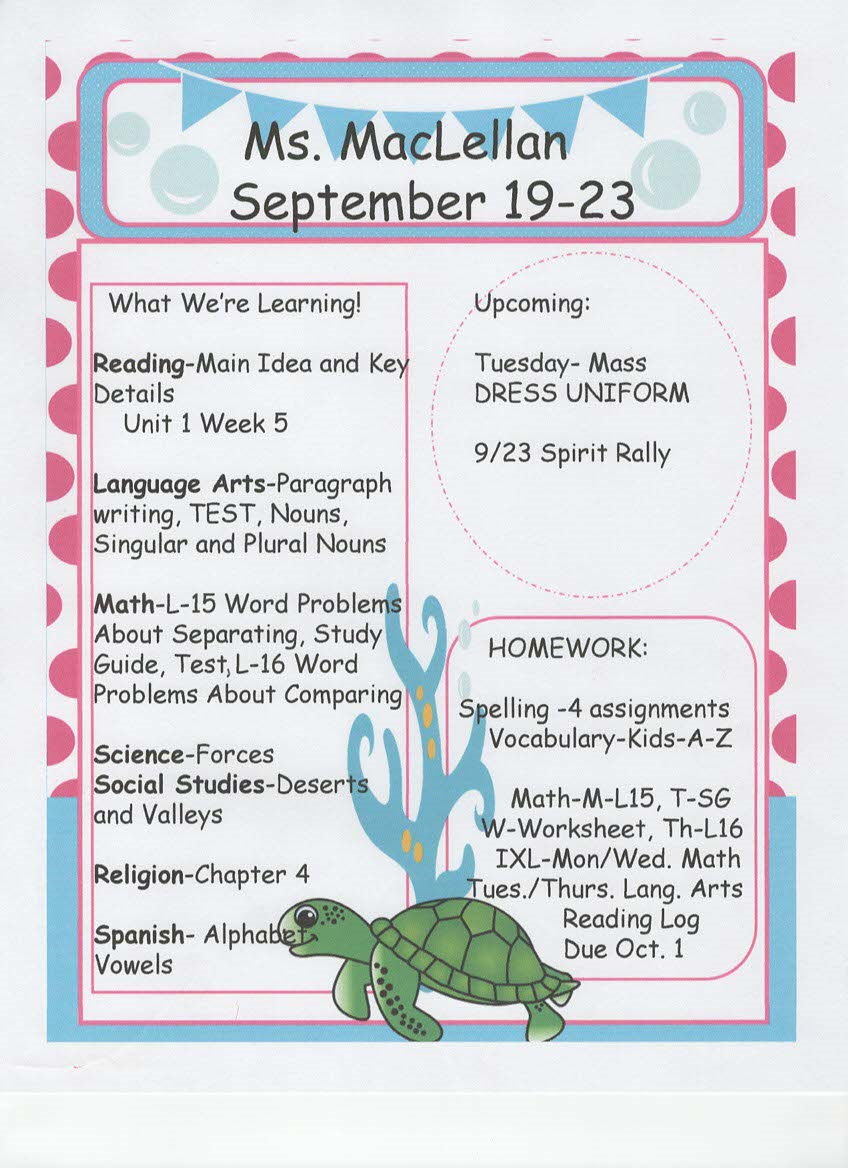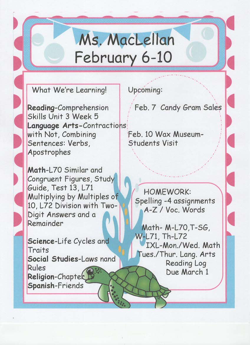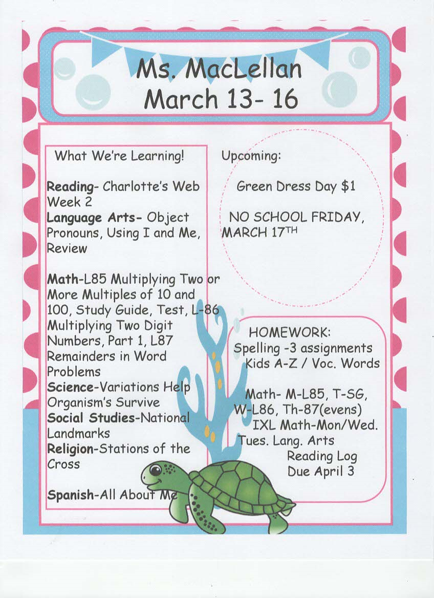 newsletter, tests, and spelling words