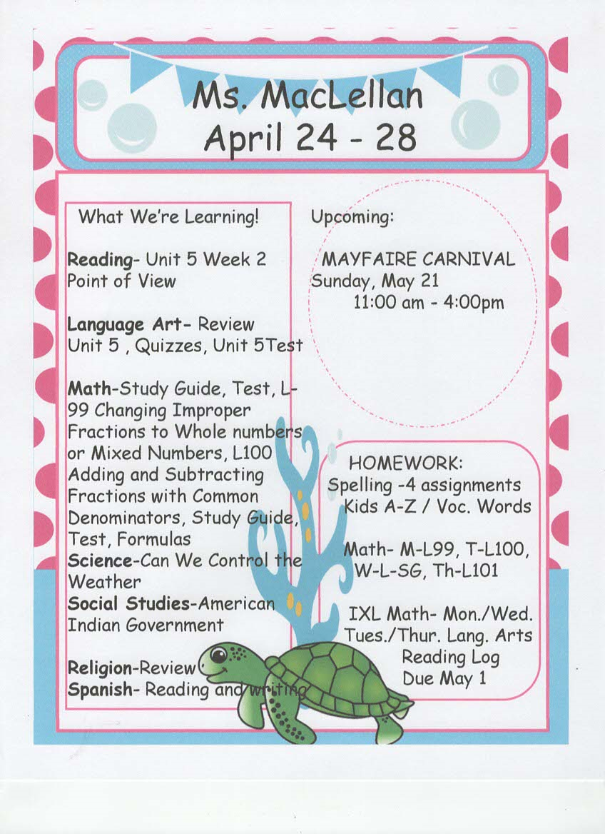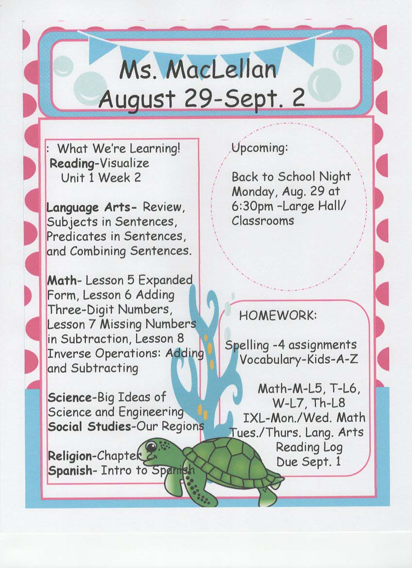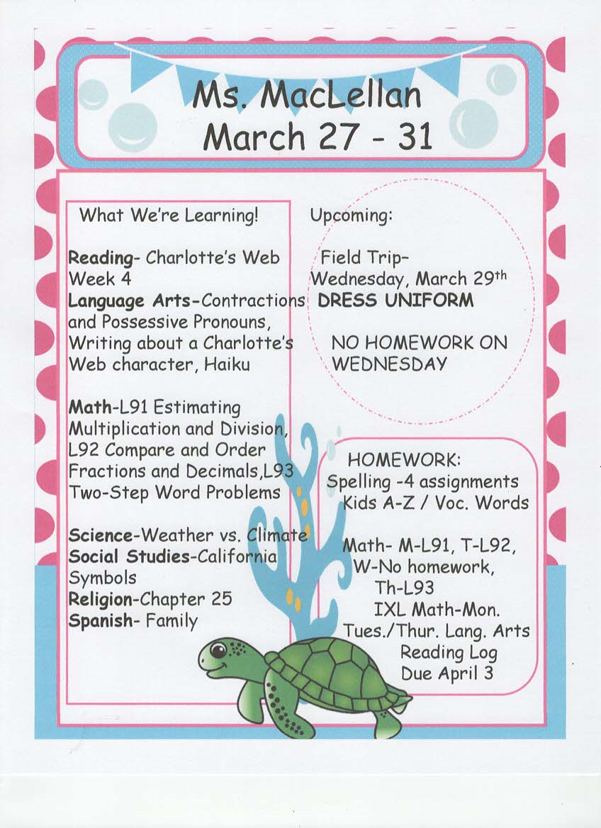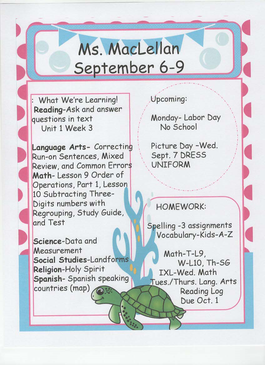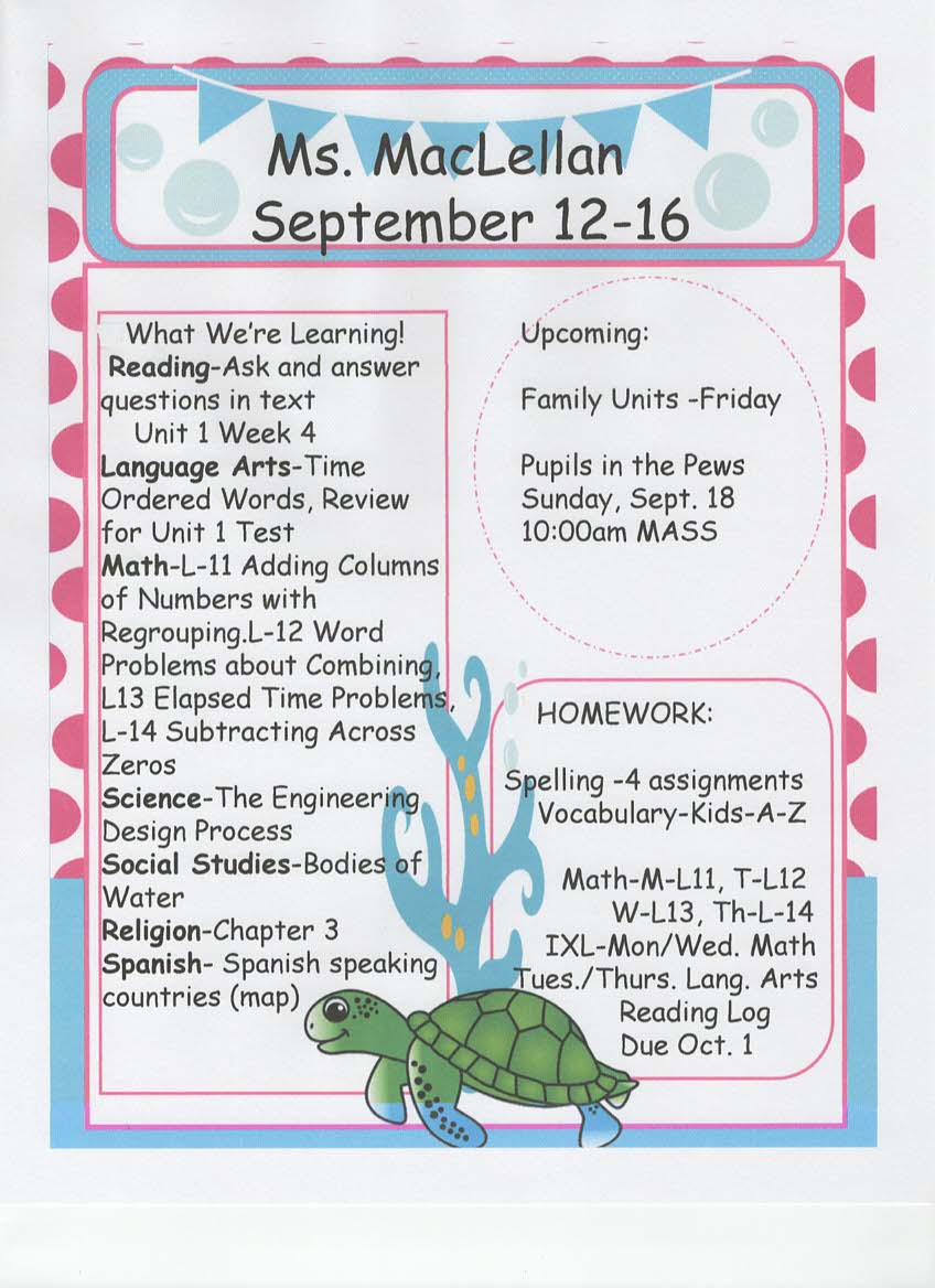 newsletter, tests, and spelling words